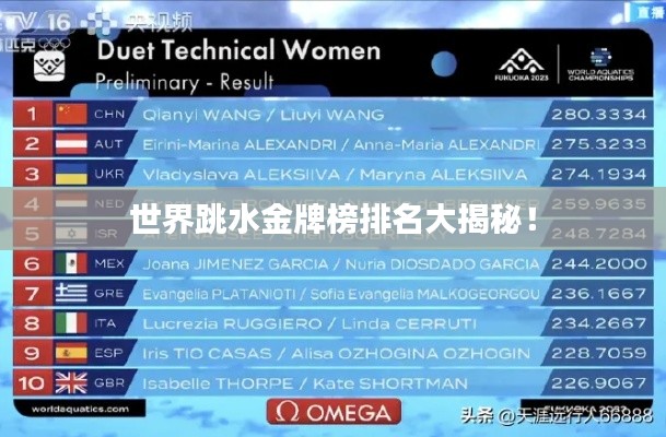 世界跳水金牌排名是根据各国选手在跳水比赛中获得的金牌数量而定的,在奥运会和世界锦标赛等重大赛事中,各国的跳水选手会展开激烈的竞争,争夺跳水金牌的荣誉,经过多年的比拼和积累,一些国家在跳水领域逐渐崭露头角,成为了世界跳水金牌排名中的佼佼者。